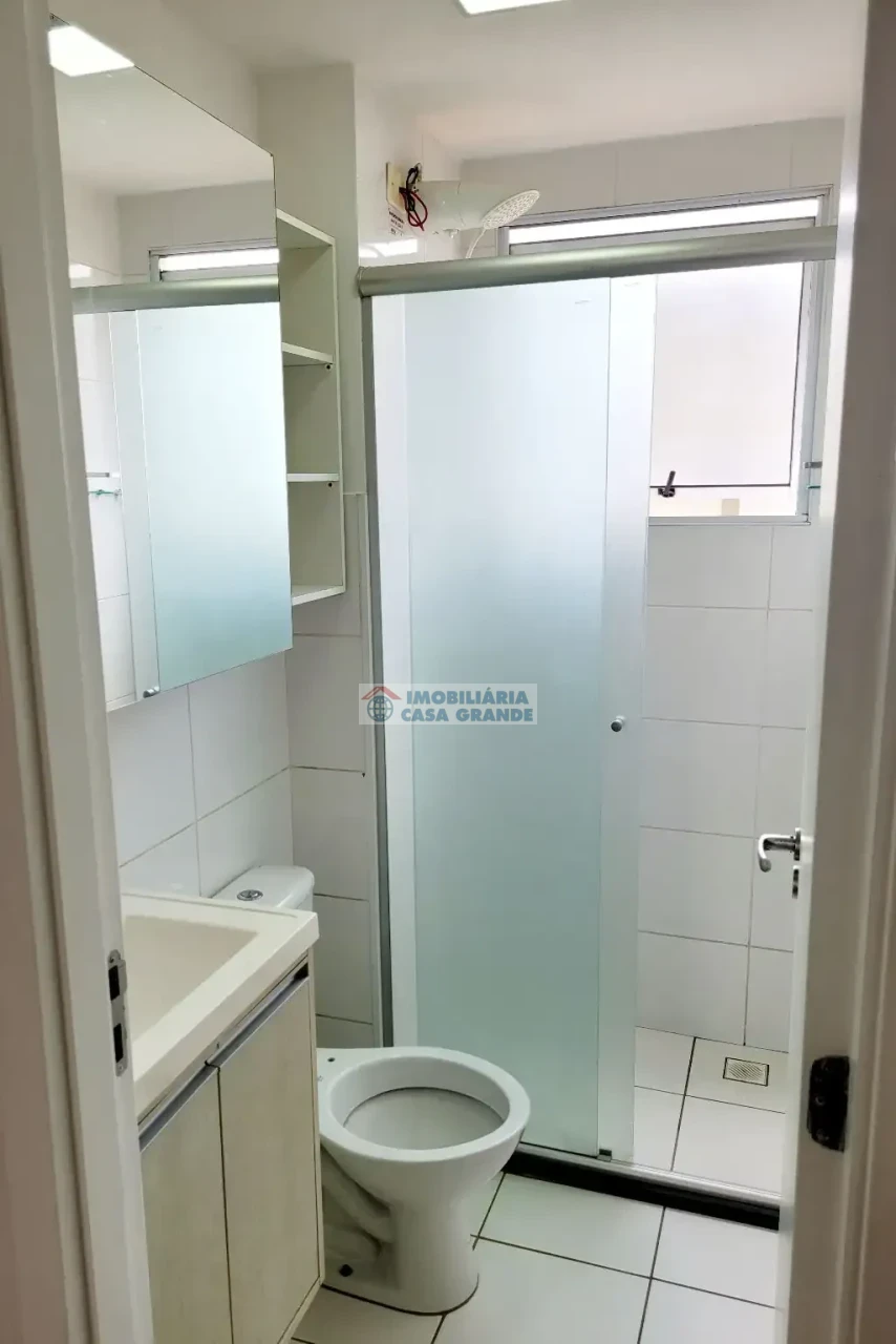 - Banheiro social com box, armário e espelho;